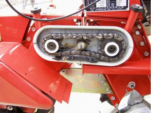 2.如果感覺開溝培土機旋耕刀與開溝培土刀工作效率慢,可拆開調整鏈條箱,將箱內齒輪對換。